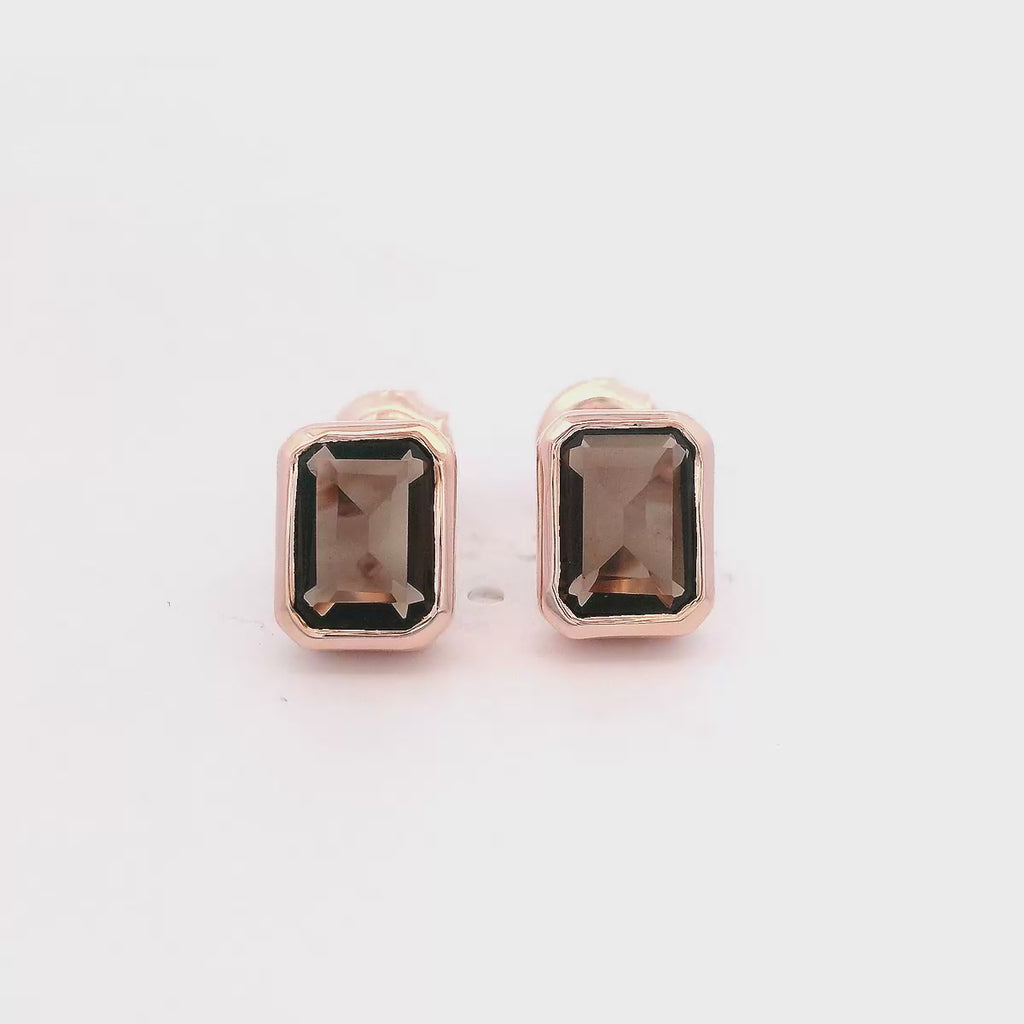 These elegant 925 rose gold earrings feature a 9mm solitary baguette smoky quartz set in a secure bezel. Their timeless design adds a subtle touch of sophistication, perfect for enhancing any outfit with a warm, smoky glow. Comfortable and durable, they make a thoughtful gift or a stylish addition to your own collection.