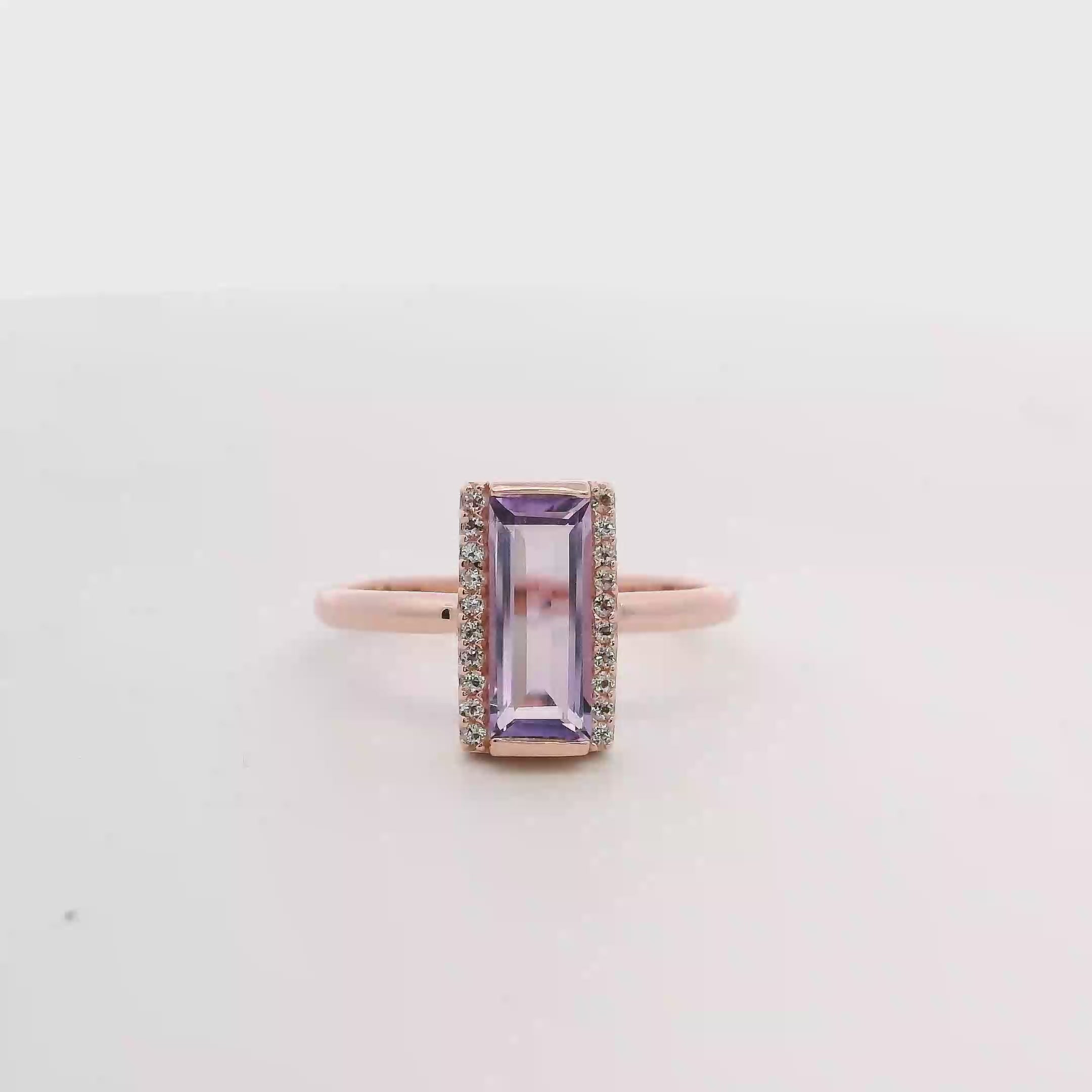 Elevate your elegance with this stunning 925RG ring featuring a radiant 11mm solitary baguette amethyst complemented by sparkling white topaz accents. Its refined design and vibrant gemstones make it the perfect statement piece to enhance any outfit with a touch of sophistication and color. Ideal for those who appreciate timeless beauty and exceptional craftsmanship.