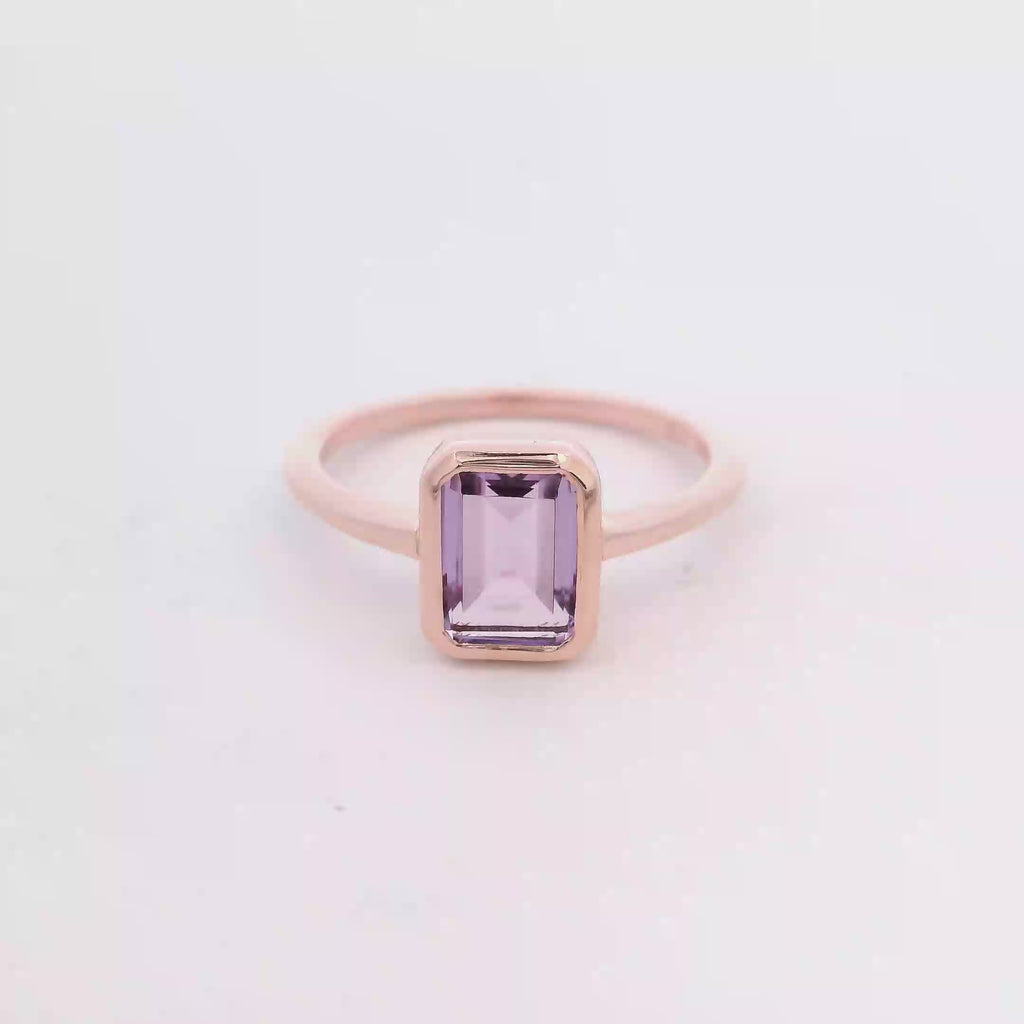 This elegant 925 rose gold ring features a 9mm solitaire baguette amethyst set in a secure bezel setting. Designed in size 6.5, it offers a refined and timeless look that complements any outfit. The rich purple hue of the amethyst adds a touch of sophistication, making it perfect for daily wear or special occasions.