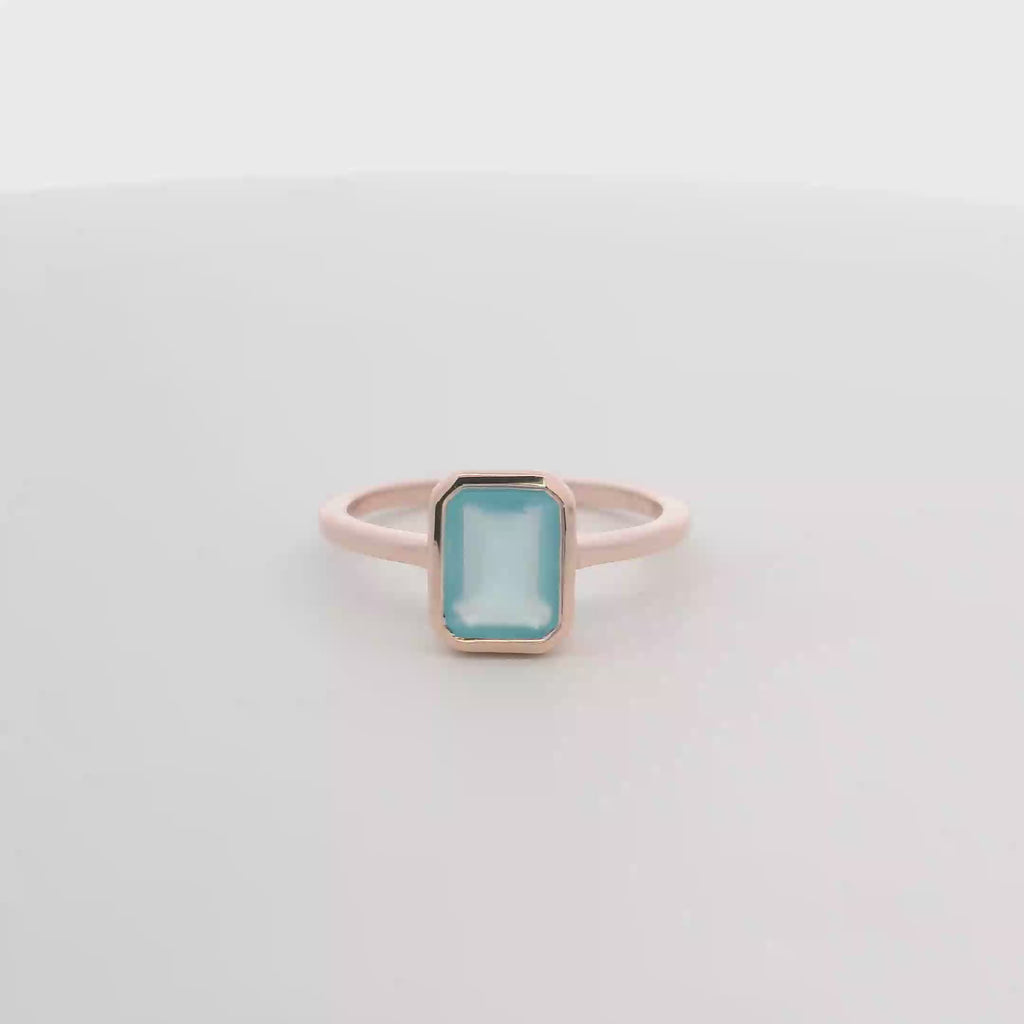 Elevate your elegance with this 925RG Solitary Baguette Chalcedony Blue Bezel Ring. Featuring a stunning 9mm chalcedony stone set in a refined rose gold bezel, this ring offers a timeless yet modern look. Perfect for adding a subtle pop of color and sophistication to any outfit, its sleek design ensures comfort and style for everyday wear or special occasions. Embrace understated luxury with this exquisite piece.
