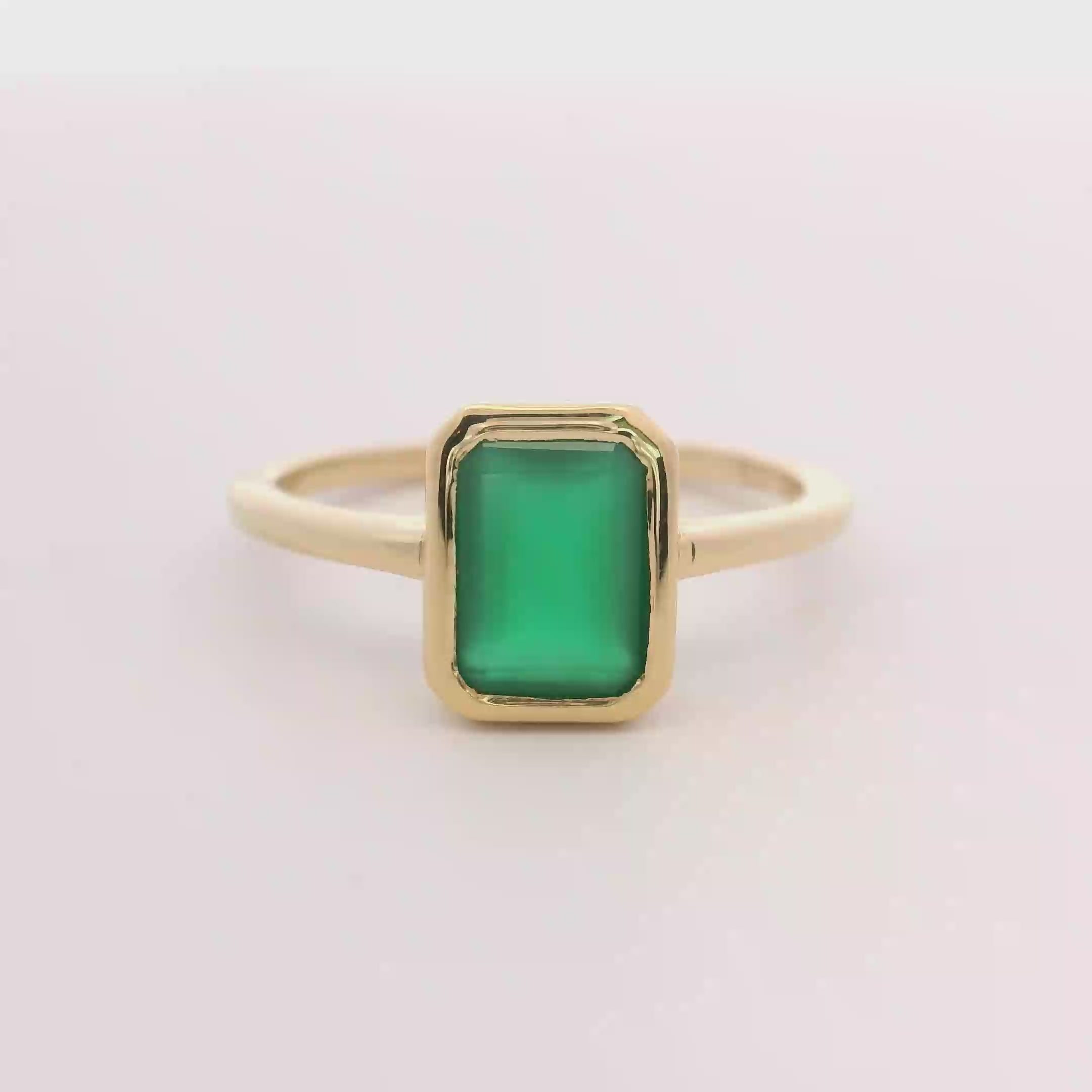 This 925 yellow gold ring showcases a solitary 9mm baguette onyx framed by a green bezel, combining elegance with a distinctive touch. Sized at T6.5, it offers a comfortable and secure fit. Ideal for those seeking a refined accessory that enhances everyday style with subtle sophistication.
