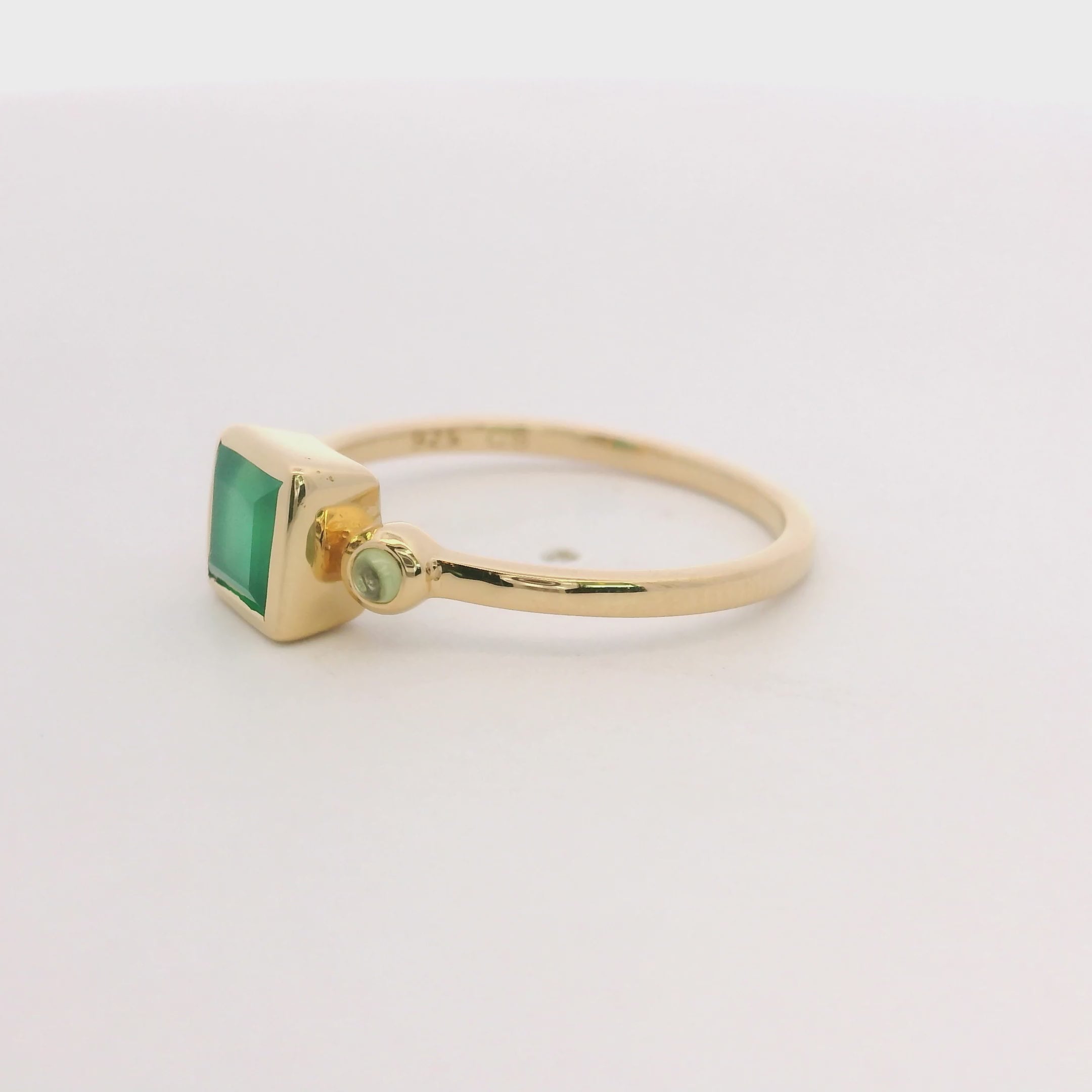 This elegant ring features a 925 yellow gold square bezel setting with a striking green onyx centerpiece, complemented by two vibrant peridot stones. Designed in size 6.5, it offers a unique blend of bold color and refined craftsmanship, perfect for adding a touch of sophistication to any outfit.