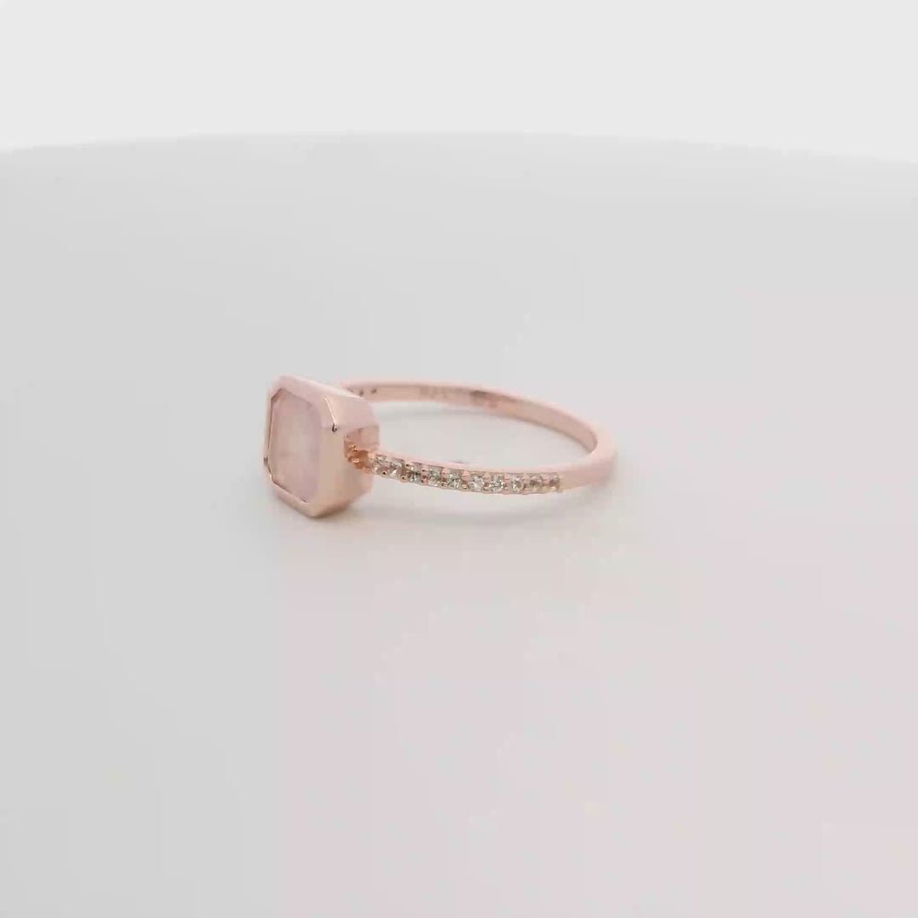 Elevate your style with this exquisite 925RG cushion bezel ring featuring a captivating rose quartz opaque stone encircled by sparkling white topaz. Its elegant design and delicate craftsmanship make it a perfect accessory to add a touch of sophistication and charm to any outfit. Ideal for those who appreciate timeless beauty and subtle luxury.