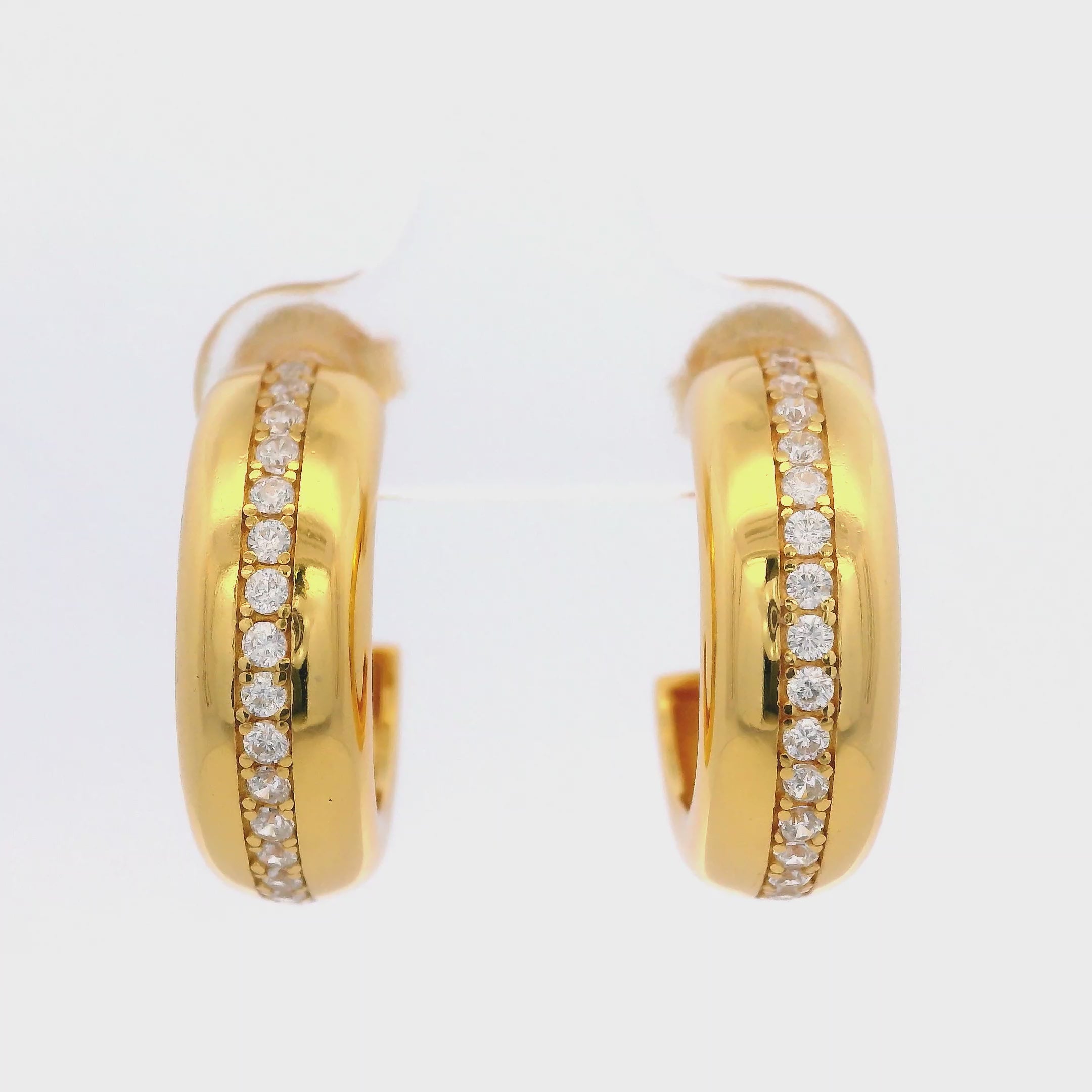 En resumen, los "925YG CHUNKY LINE HOOPS CZ" son aretes de aro de plata de ley con baño de oro amarillo, de diseño grueso, con una sola línea de circonitas cúbicas incrustadas.