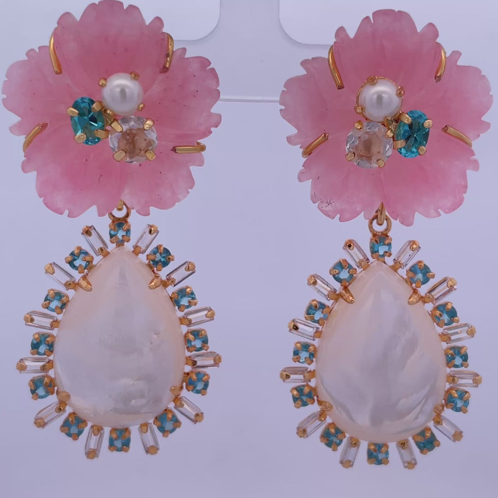 EARRINGS CARVED ROSE QUARTZ FLOWER WITH PEAR MOTHER OF PEARL DROP SURROUNDED WITH BLUE TOPAZ AND CLE