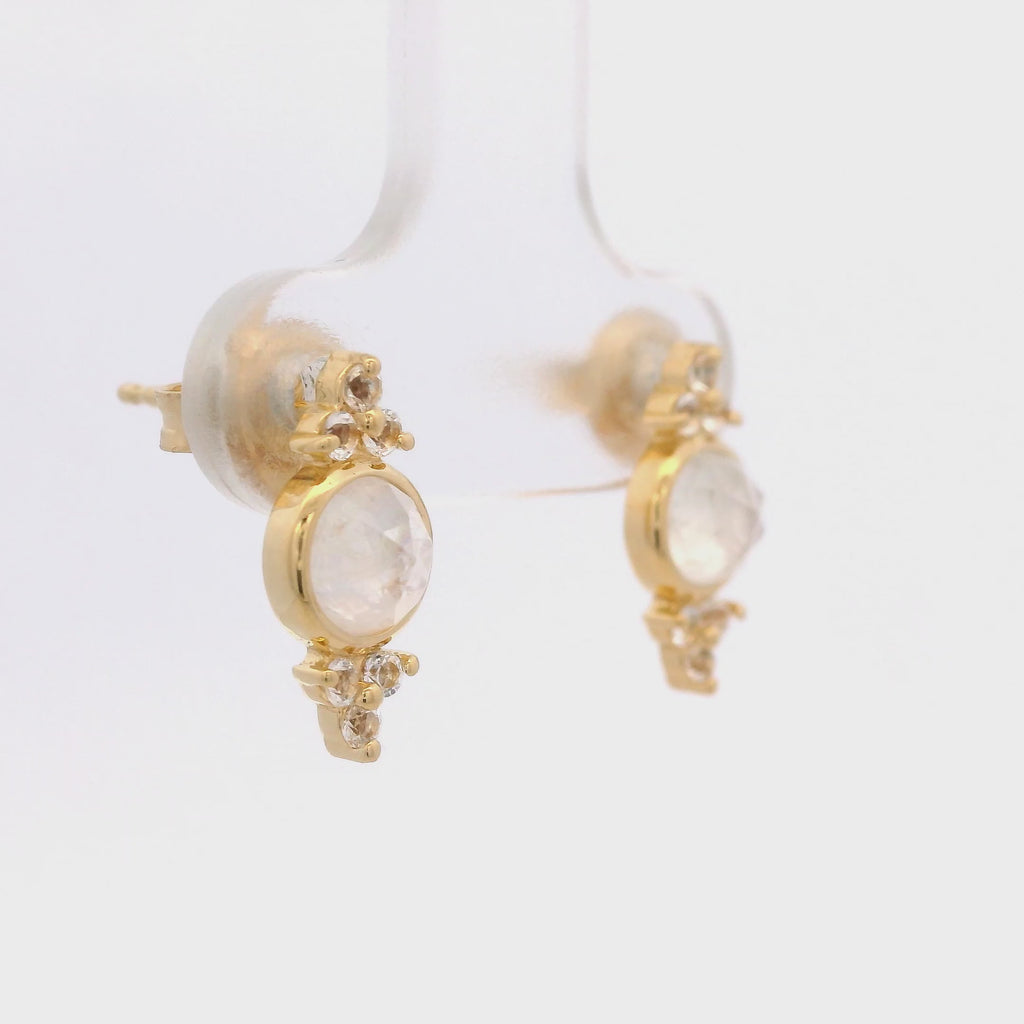 Aretes de Piedra Luna con Engaste de Bisel y Puntas de Topacio Blanco en Plata 925 Bañada en Oro.