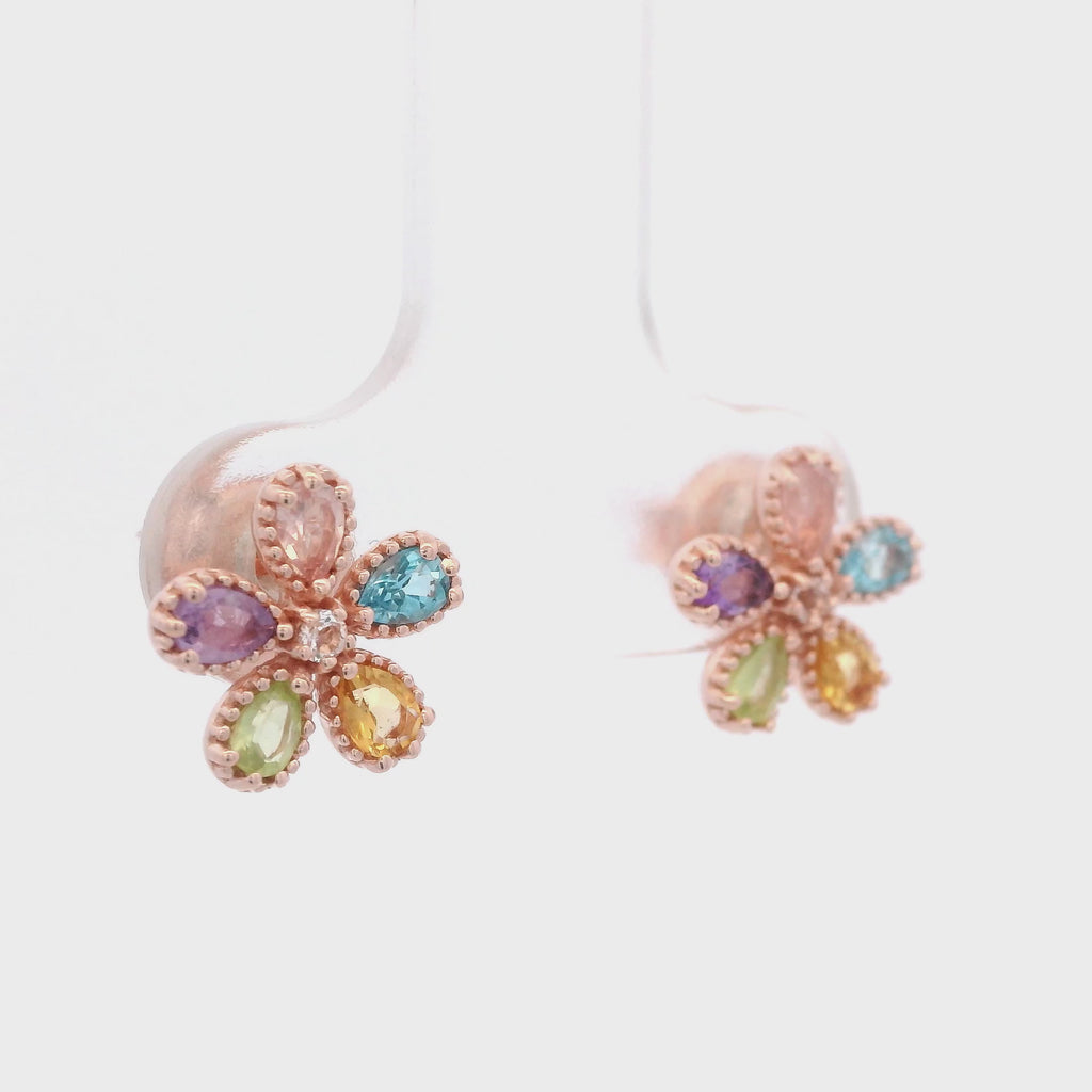 Aretes de Flor Multigema con Topacio Blanco Central en Plata 925 Bañada en Oro Rosa.