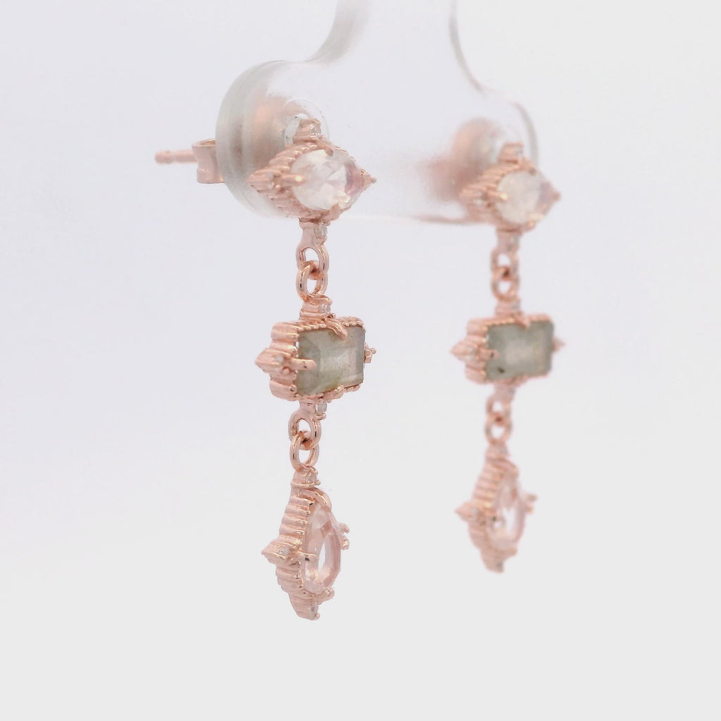 Aretes de Piedra Luna Ovalada y Labradorita Rectangular en Plata 925 Bañada en Oro Rosa.