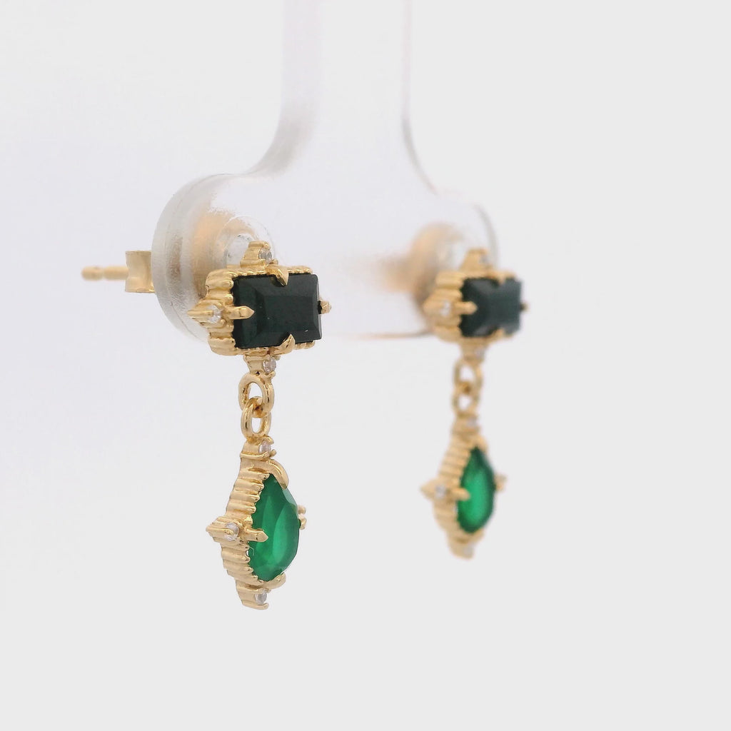 Aretes de Espinela Negra Rectangular con Colgante de Ónix Verde y Zirconia en Plata 925 Bañada en Oro.