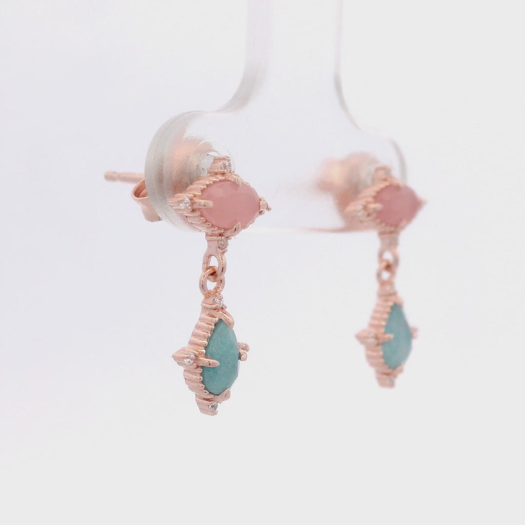 Aretes Colgantes de Cuarzo Rosa Ovalado y Circonita Aqua en Plata 925 Bañada en Oro Rosa.
