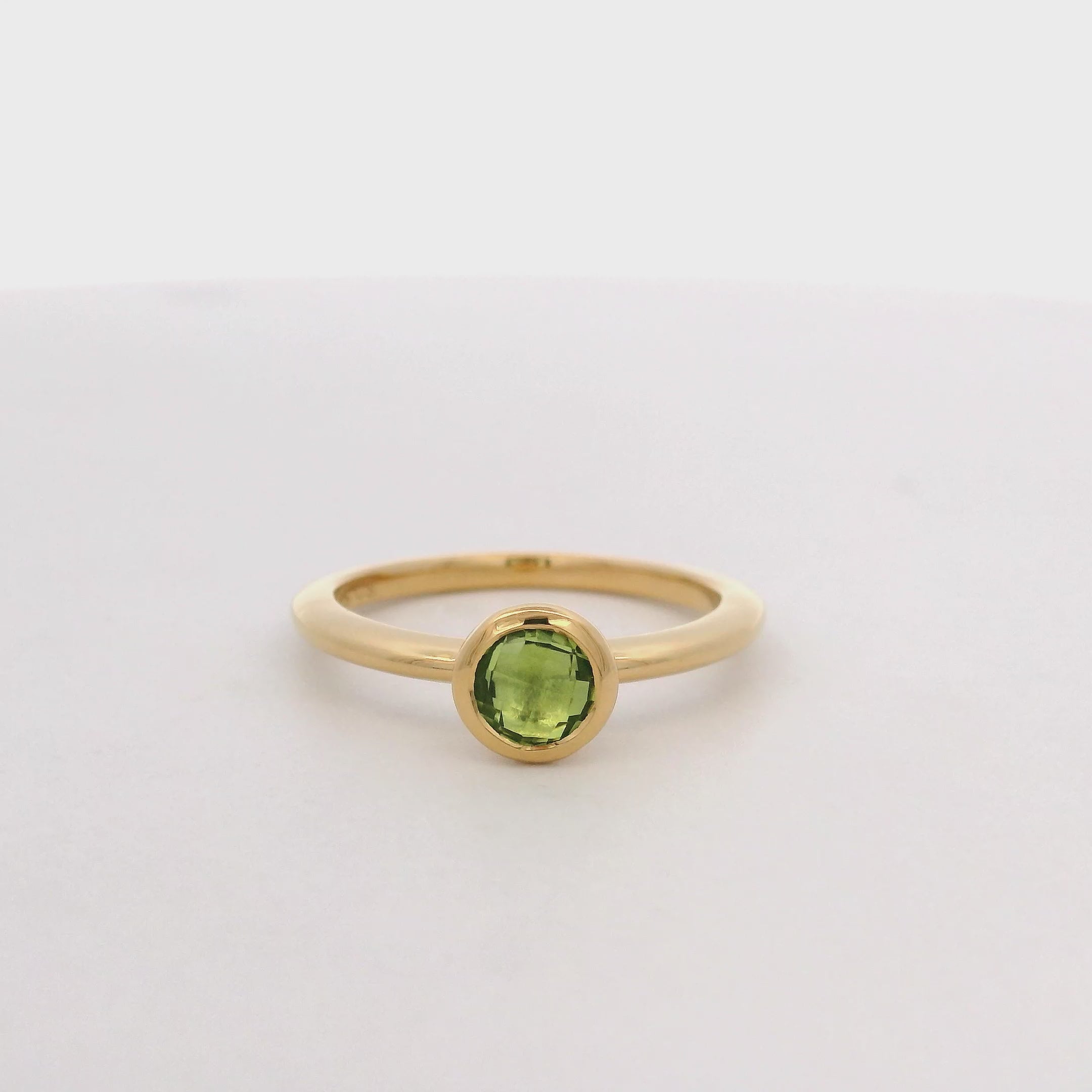 En resumen, es un anillo solitario de plata de ley con baño de oro amarillo, en Talla 6.5, cuyo diseño se centra en un único peridoto verde de 6 mm engastado de forma segura con un bisel de metal.