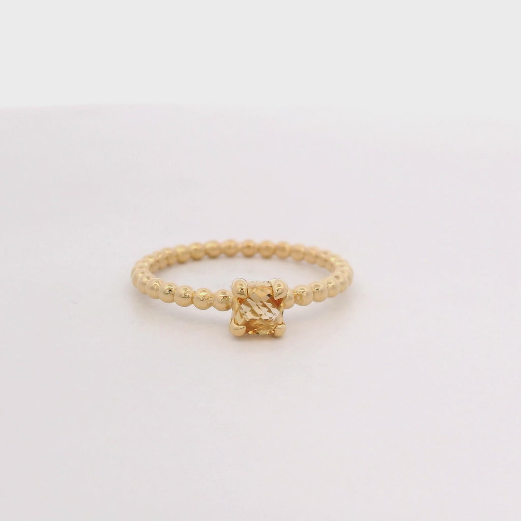 En resumen, se trata de un anillo solitario con baño de oro amarillo que presenta un citrino de tono dorado, engastado en un diseño de banda, todo en talla 6.5.