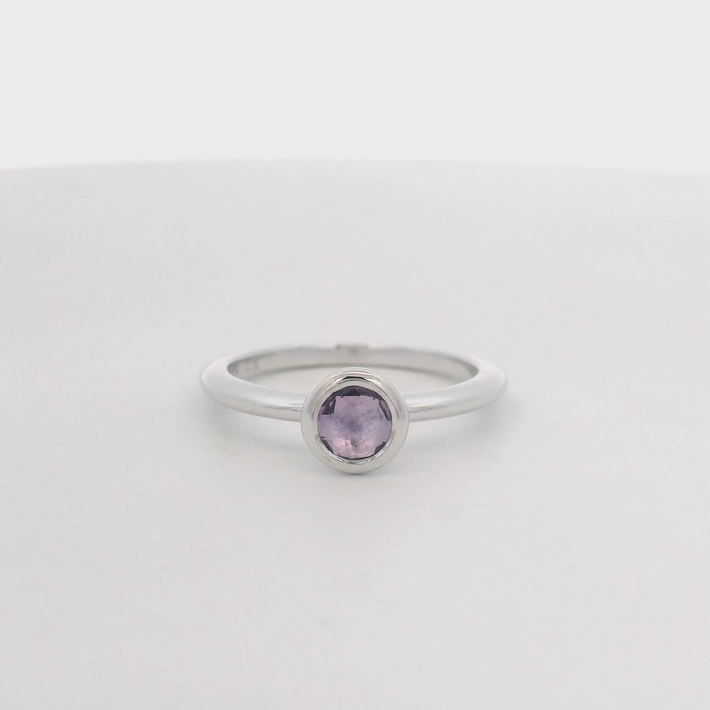 El diseño es solitario, lo que significa que presenta una única piedra destacada. Esta gema es una Amatista (AMETHYST), conocida por su color violeta o púrpura. La amatista está engastada en un bisel (BEZEL), una montura de metal que rodea completamente el borde de la piedra, proporcionando una sujeción segura y un perfil liso y moderno.
